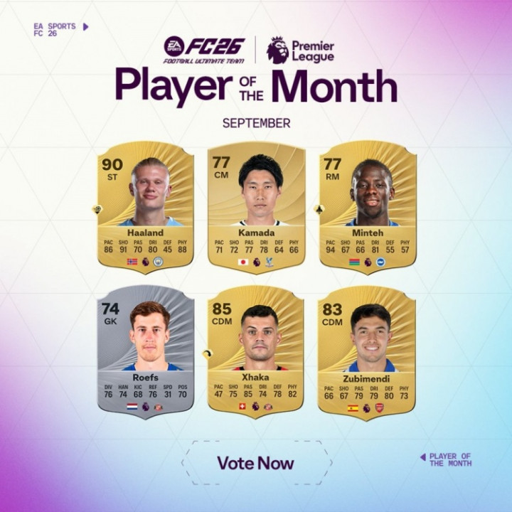 直播吧10月2日讯EA官方公布了英超9月最佳球员候选,哈兰德、扎卡、苏维门迪在列。